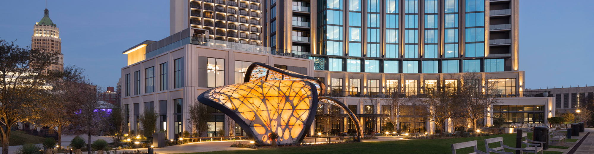 Inspired by the extraordinary migration of the monarch butterfly, La Mariposa gracefully assumers her role as San Antonio’s newest icon. This open air, sculptural pavilion pays homage to a journey shaped by transformation, and beautifully adorns the space between the hotel and the park just beyond.