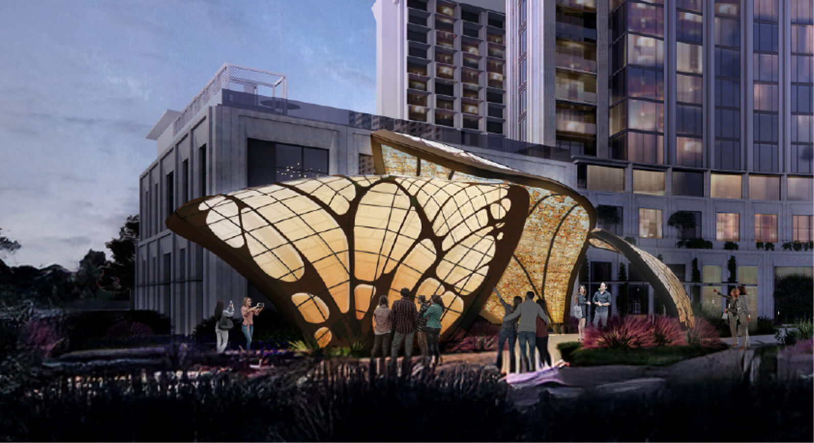 Set within an urban greenspace, the 4,000 sq. ft. La Mariposa Pavilion is an open-air venue carried by the sculptural wings of its namesake. Iconic and intentionally grounded, it creates a fluid, nature forward setting for ceremonies, celebrations, and gatherings.