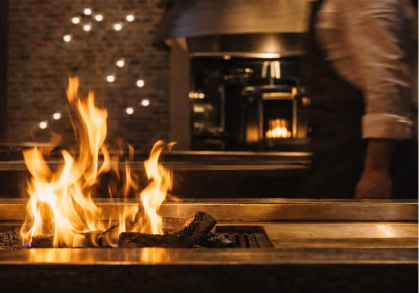 A modern Texas steakhouse shaped by fire, oak, and refined technique. Seasonal ingredients, Gulf seafood, and fire-seared cuts unfold in front of a visible hearth, creating an intimate dining experience where tradition and precision meet, and every detail is guided by craft and quiet confidence.