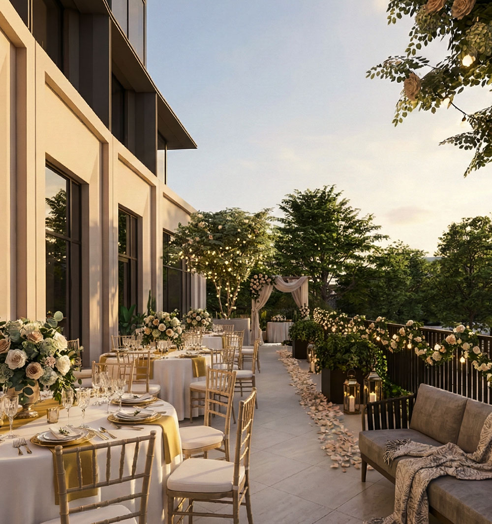 Perched above the park, The Kaleidoscope Terrace offers an unmatched open-air setting, elevated, insulated, and shaped with effortless grace. More than a terrace, it’s an independent venue where gatherings unfold with clarity, calm, and delicate beauty.